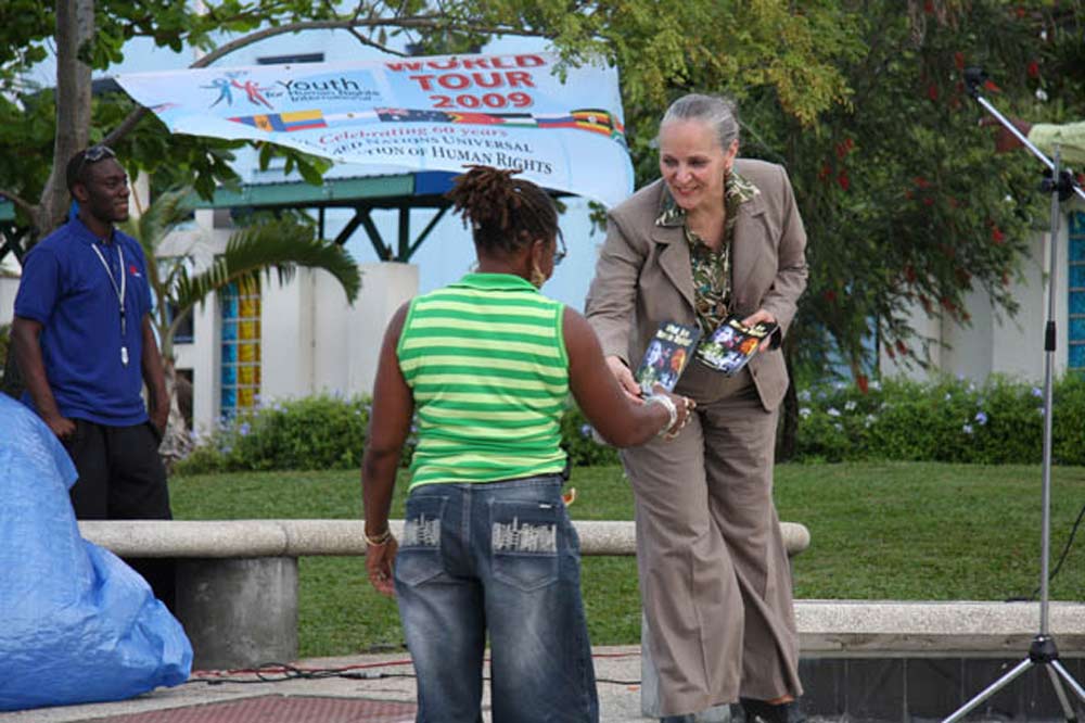 Mary Shuttleworth, grundlægger og formand for YHRI, fortsætter med sine undervisningsaktiviteter om menneskerettigheder med børn under Verdensturnéens ophold på Barbados.