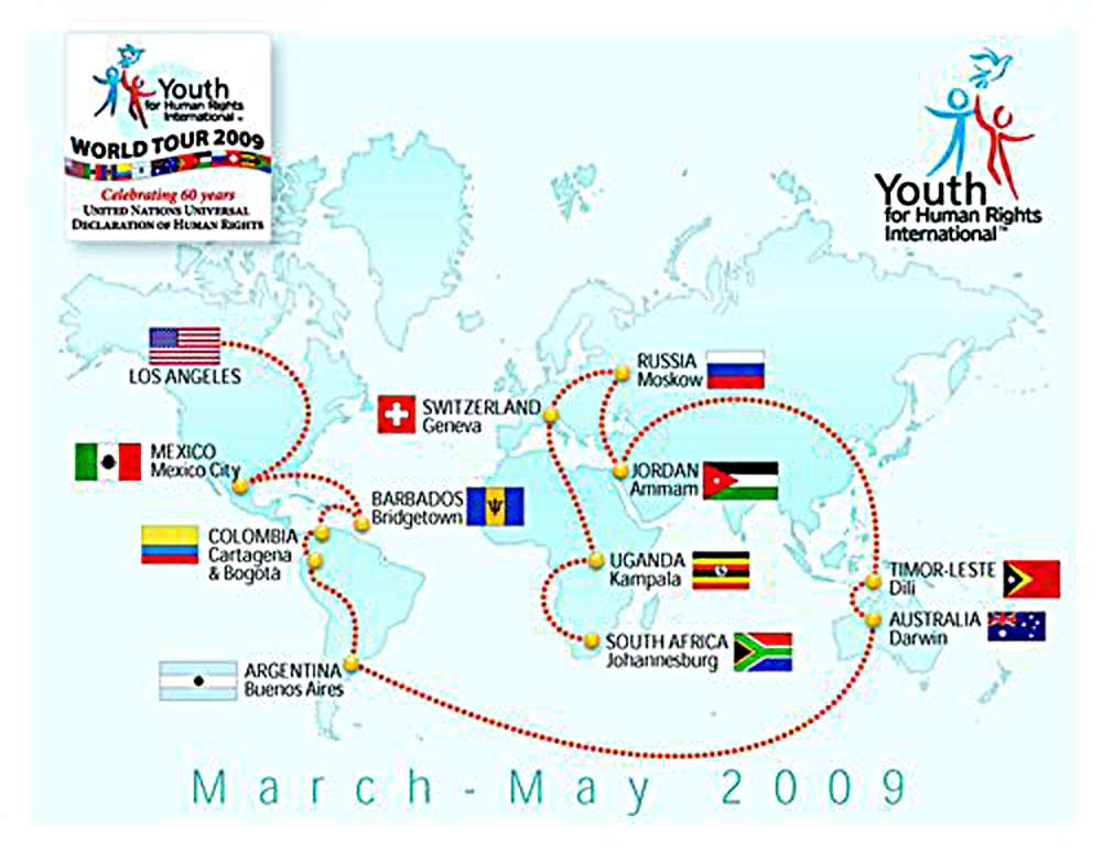 La gira mundial 2009 de Jóvenes por los Derechos Humanos Internacional incluirá a Argentina, Australia, Barbados, Colombia, Jordania, México, Rusia, Sudáfrica, Suiza, Timor Oriental, Uganda y los Estados Unidos. Se celebrarán reuniones con dignatarios y líderes así como eventos comunitarios en todos los países. Además, nuestras actividades serán capturadas en vídeo y fotografía para futura promoción de la gira.